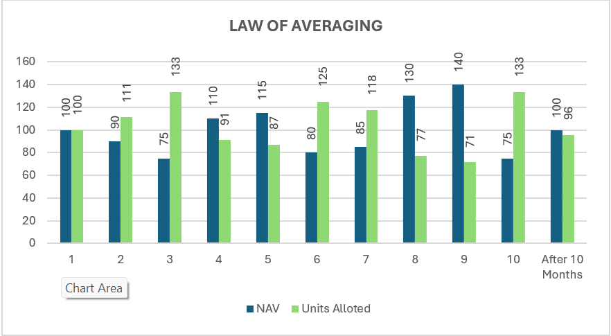 The Law of Averaging helps investors reduce the impact of market ups and downs. By investing a fixed amount regularly (for example, through a SIP in mutual funds), you automatically: